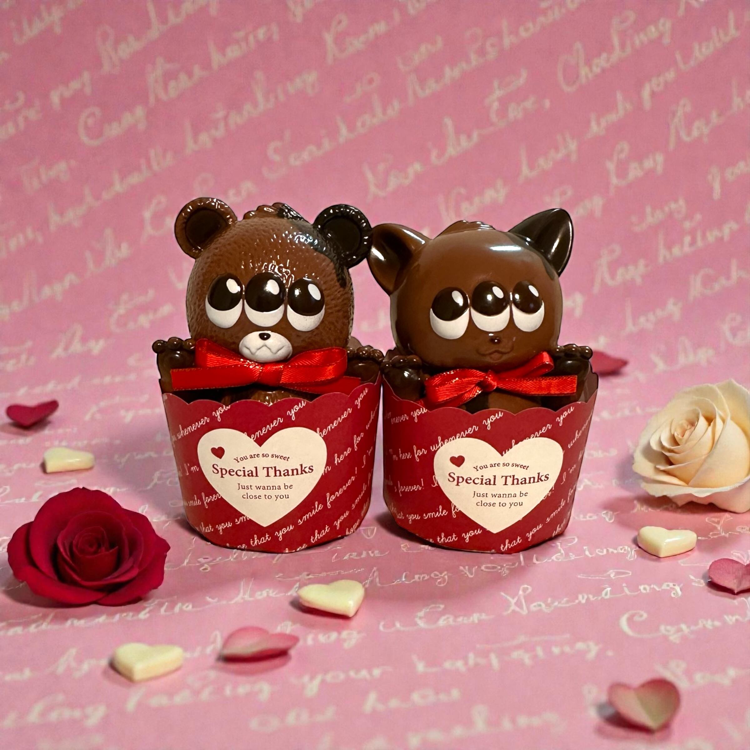 胸に赤いリボンを付けて、お菓子のようなラッピングでお届けします!