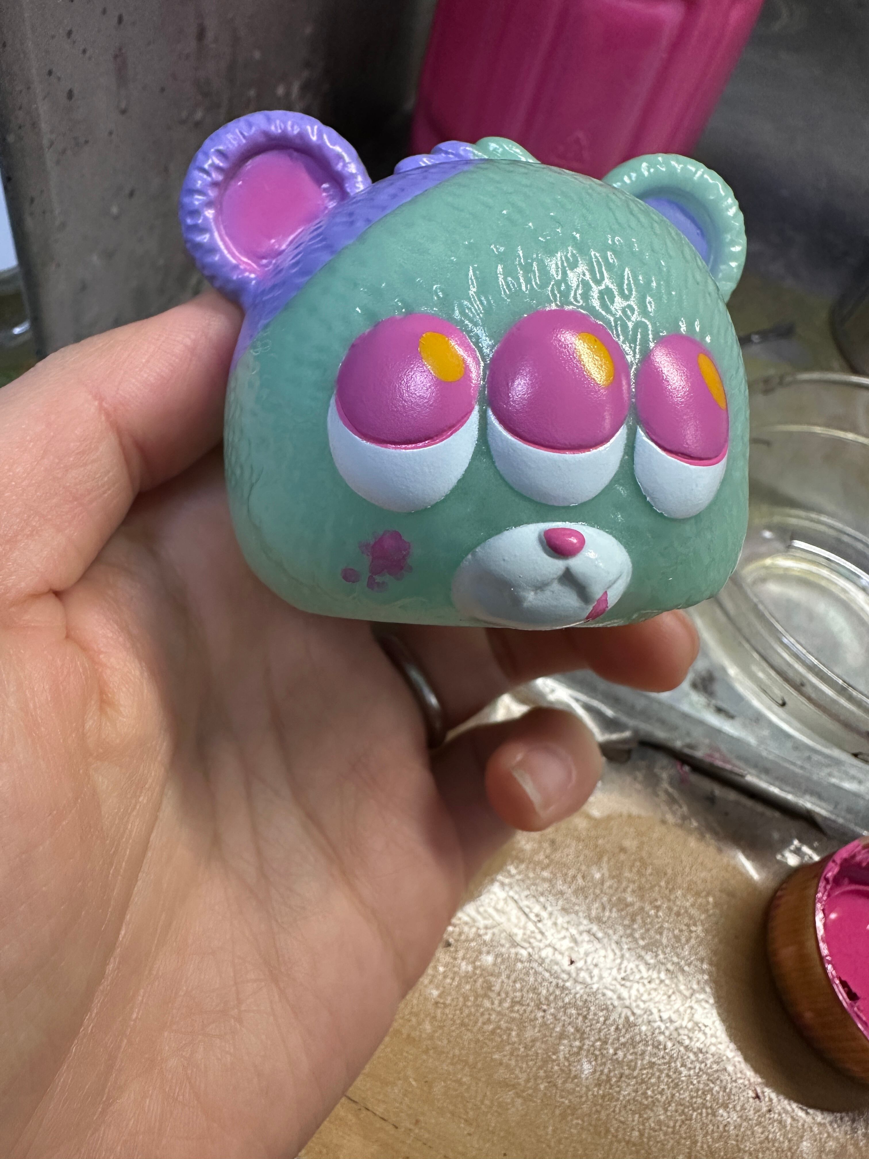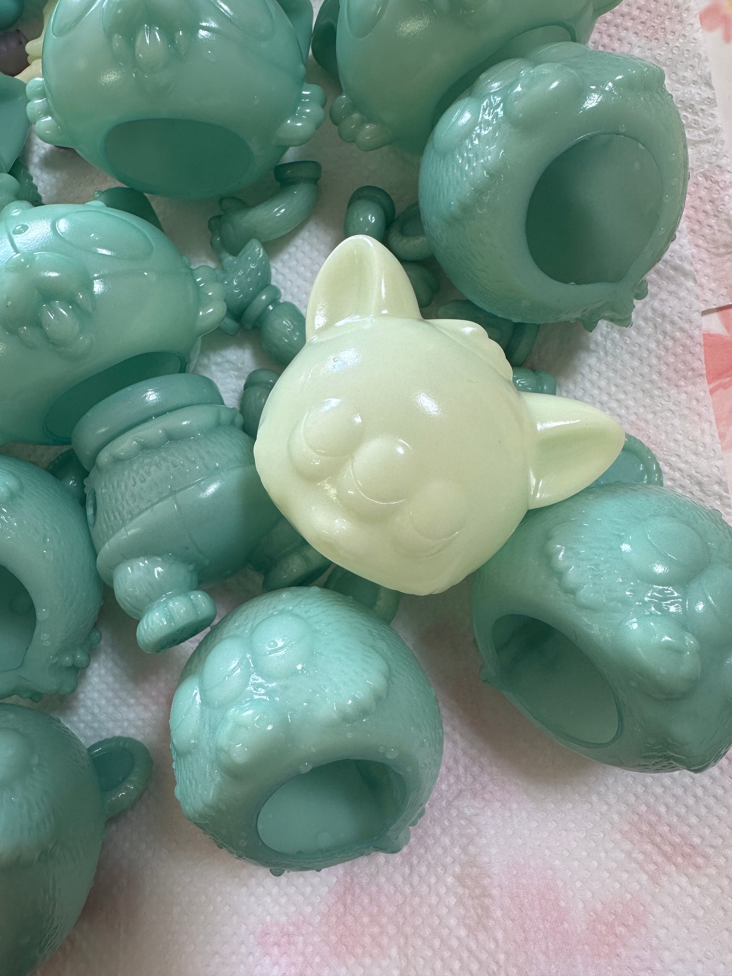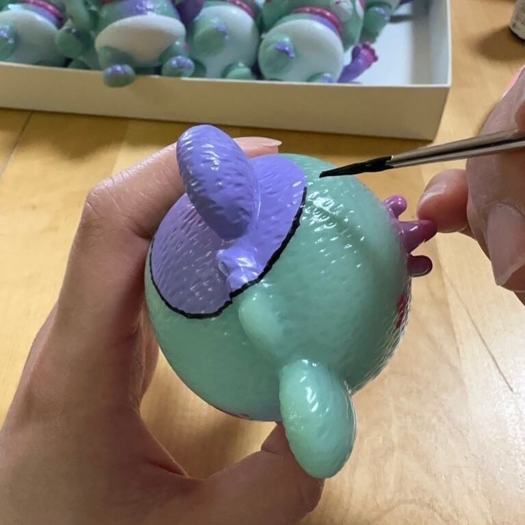 蓄光素体を緑で染めてから塗装し、つぎはぎなど筆塗りで丁寧に描きました!