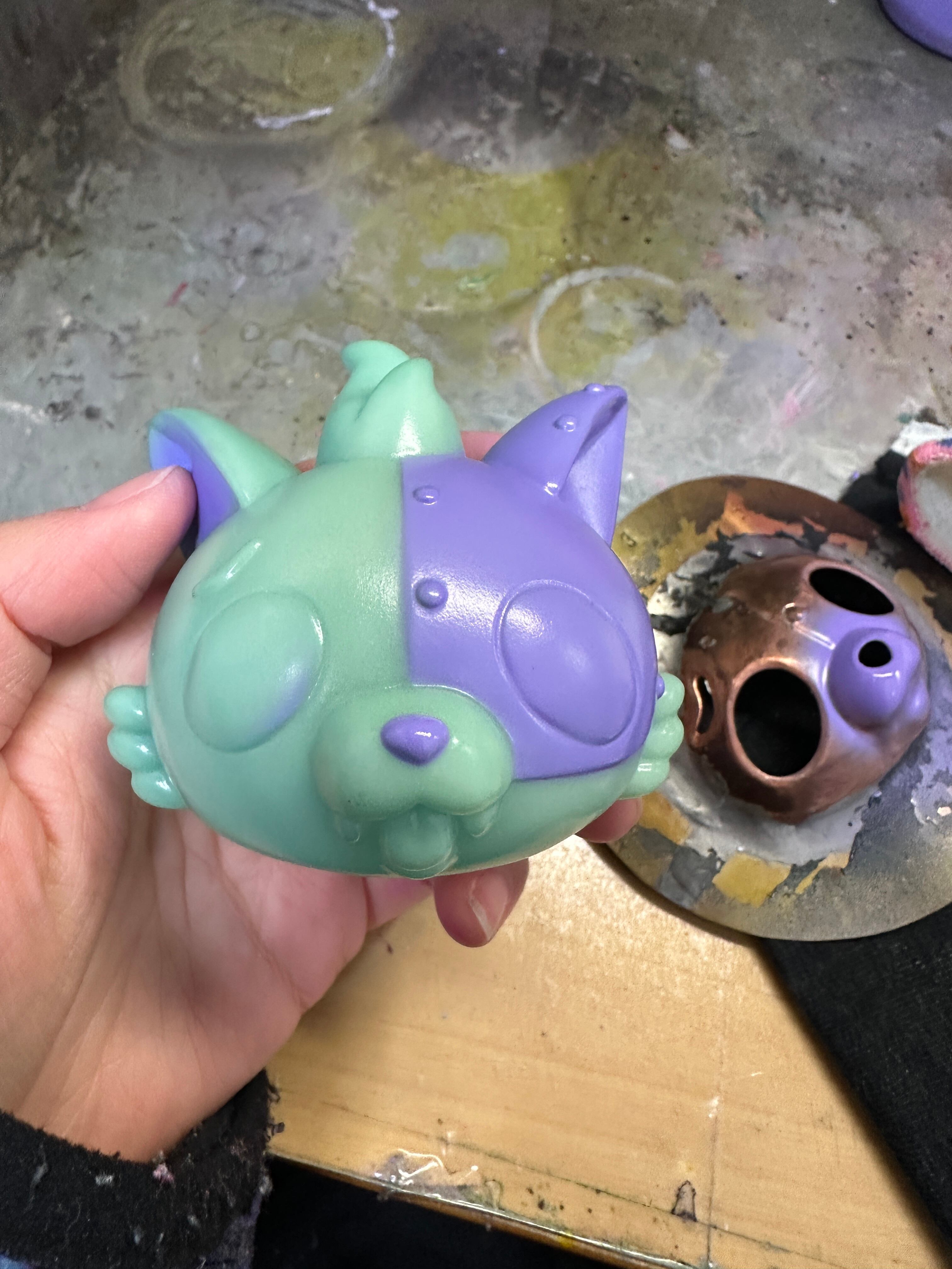 蓄光素体を緑で染めてから塗装し、つぎはぎなど筆塗りで丁寧に描きました!